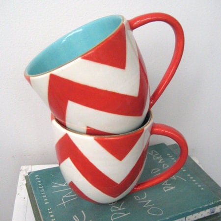 I found my local ceramics painting shop, Paint the Town, and chose a barrel mug. I used Scotch painter's tape to make my lines and painted away! The taping took the most time...